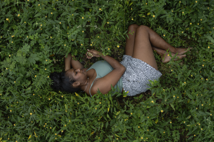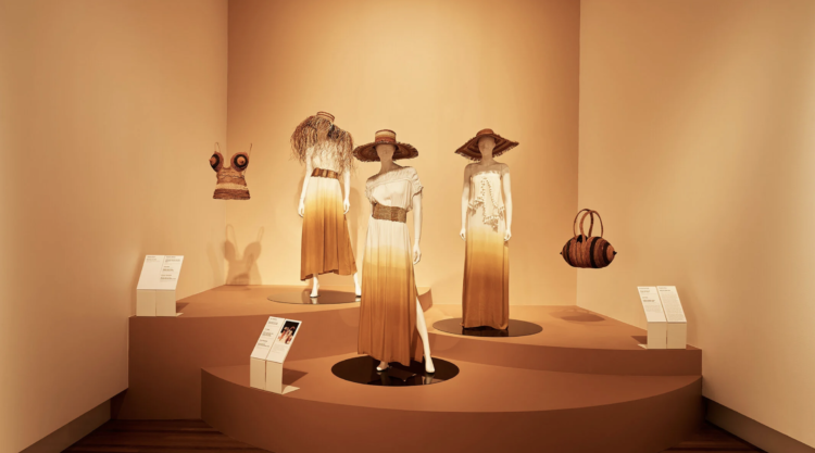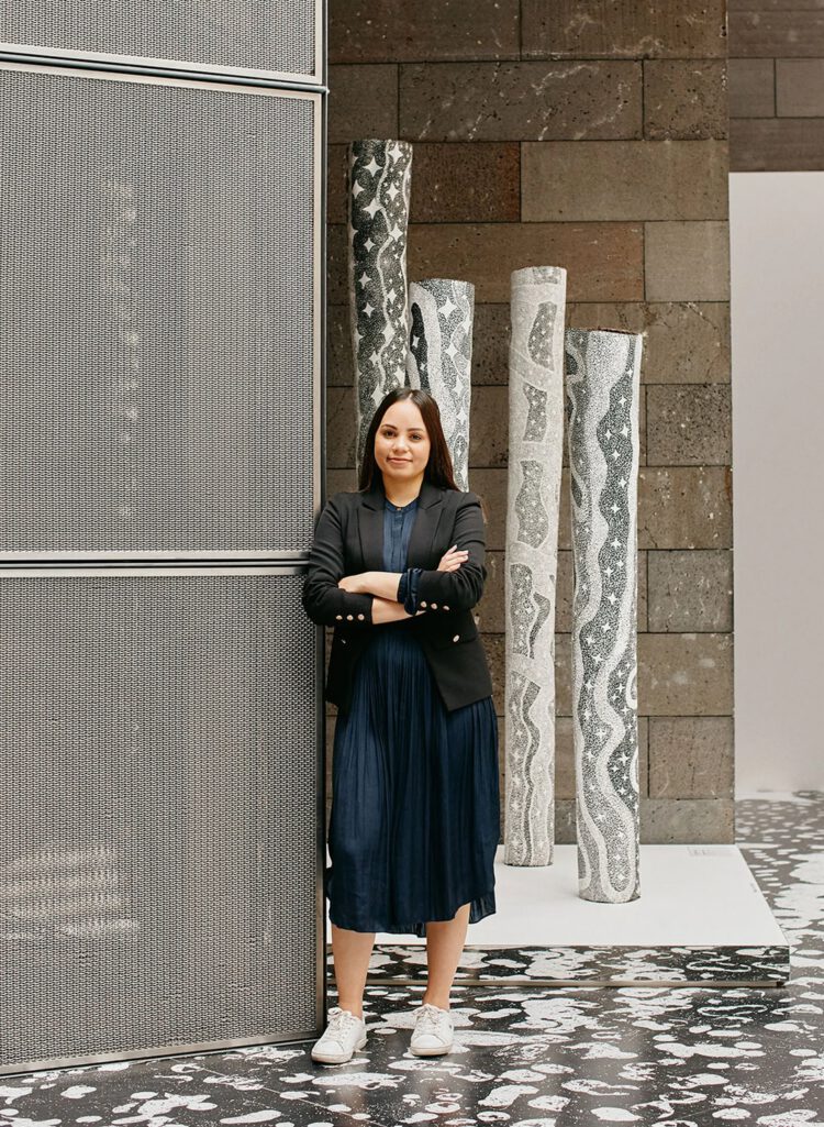 Shonae Hobson in front of Naminapu Maymuru-White’s Milŋiyawuy (River of Stars) installation, Bark Ladies exhibition, National Gallery of Victoria. Photo credit: Amelia Stanwix and The Design Files.